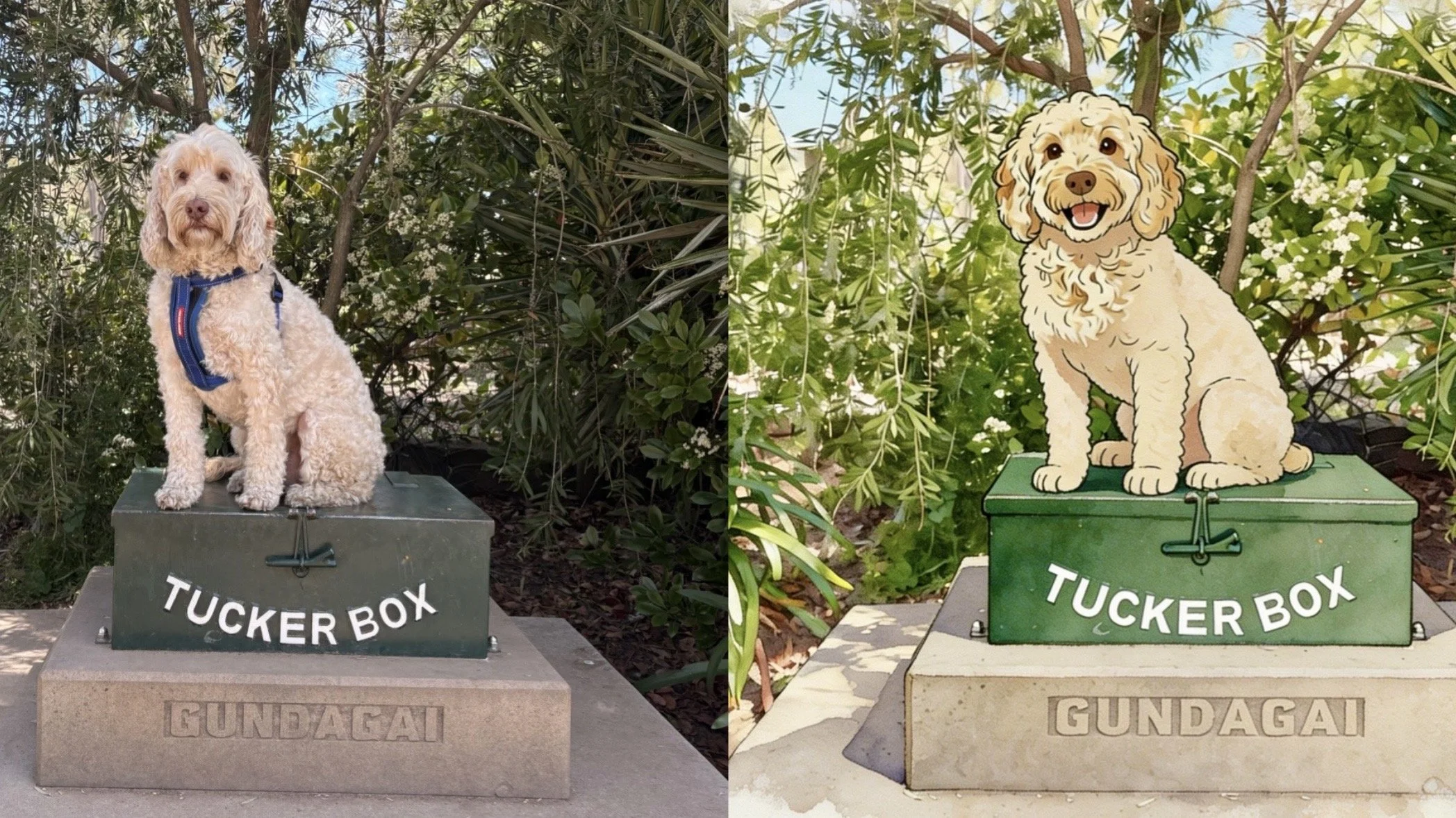 Without giving too much away, I wanted to share just a few of the images used to tell the story of Archie’s adventure. The first image I wanted to share was Archie sat on the Tucker box in Gundagai, NSW.